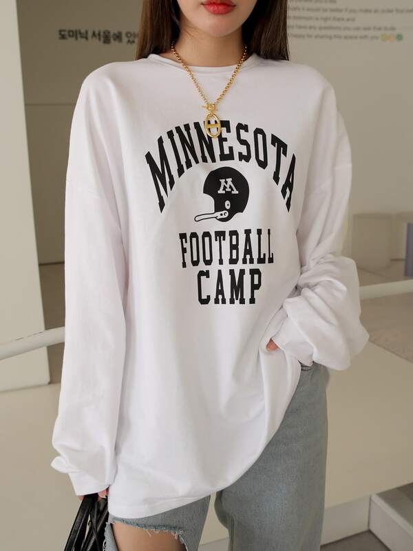 เสื้อยืดโอเวอร์ไซส์ ลายตัวอักษรกราฟิก ดีเทลไหล่ตก 250 ฿