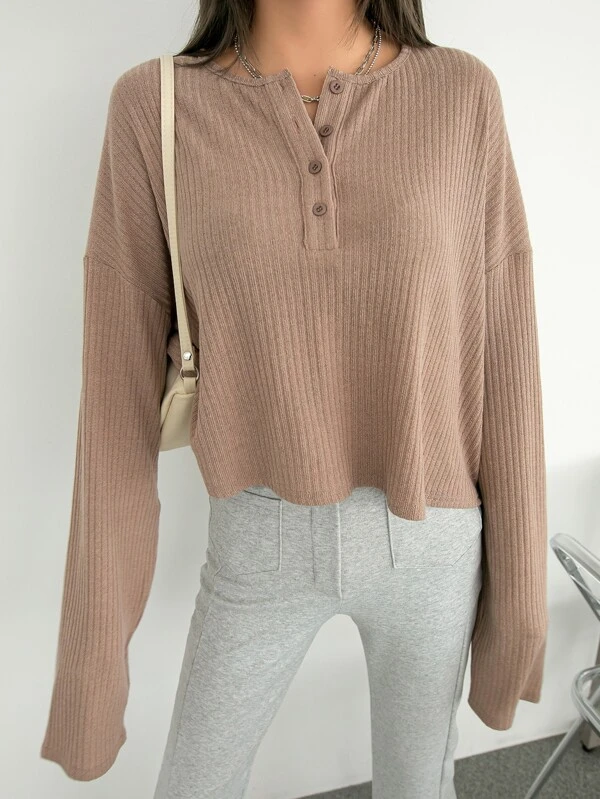 เสื้อยืด ผ้าถัก ดีเทลไหล่ตก กระดุมครึ่งบน 216฿